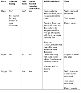 The list should include the types of lessons taught in your program. Notes should also be made regarding what populations the horse can or cannot work with. For example, some horses may do well with adults but not with children. Some horses may excel with riders who have cognitive delays, but struggle with riders who have high tone.