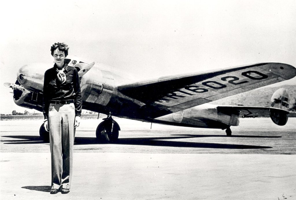 - Amelia_Earhart_standing_under_nose_of_her_Lockheed_Model_10-E_Electra,_small_(cropped) is licensed under a Public Domain license