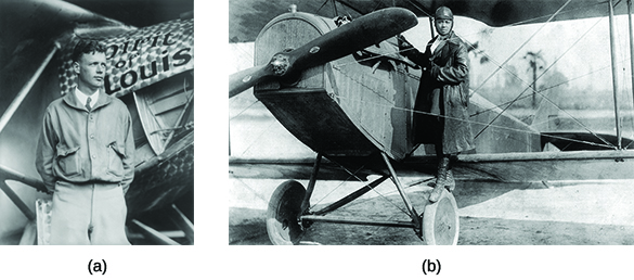 The 1920s not only witnessed a transformation in ground transportation but also major changes in air travel. By the mid- 1920s, men—as well as some pioneering women like the African American stunt pilot Bessie Coleman (Figure)—had been flying for two decades. But there remained doubts about the suitability of airplanes for long-distance travel. Orville Wright, one of the pioneers of airplane technology in the United States, once famously declared, “No flying machine will ever fly from New York to Paris [because] no known motor can run at the requisite speed for four days without stopping.” However, in 1927, this skepticism was finally put to rest when Charles Lindbergh became the first person to fly solo across the Atlantic Ocean, flying from New York to Paris in thirty-three hours (Figure 4.1.5).