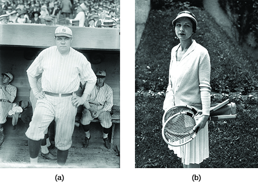 Radio also transformed how Americans enjoyed sports. The introduction of play-by-play descriptions of sporting events broadcast over the radio brought sports entertainment right into the homes of millions. Radio also helped to popularize sports figures and their accomplishments. Jim Thorpe, who grew up in the Sac and Fox Nation in Oklahoma, was known as one of the best athletes in the world: He medaled in the 1912 Olympic Games, played Major League Baseball, and was one of the founding members of the National Football League. Other sports superstars were soon household names. In 1926, Gertrude Ederle became the first woman to swim the English Channel. Helen Wills dominated women’s tennis, winning Wimbledon eight times in the late 1920s (Figure), whereas “Big Bill” Tilden won the national singles title every year from 1920 to 1925. In football, Harold “Red” Grange played for the University of Illinois, averaging over ten yards per carry during his college career. The biggest star of all was the “Sultan of Swat,” Babe Ruth, who became America’s first baseball hero (Figure 4.1.7). He changed the game of baseball from a low-scoring one dominated by pitchers to one where his hitting became famous. By 1923, most pitchers intentionally walked him. In 1924, he hit sixty homeruns.