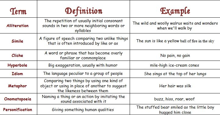 There are many types of figurative language, and the table below defines the most common ones. Students pursuing English degrees or a writing career may want to become more familiar with each category of figurative language; however, most of us shouldn’t worry if we can explain the exact difference between a metaphor and a simile. When developing pathos through figurative language, writers pay attention not only to the meaning of words, but the effect of the sound and pattern of words that they write. Therefore, you should focus on the following: