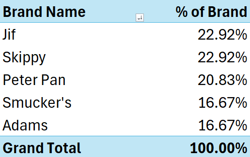 - What’s the preferred peanut butter brand? (Adams, Peter Pan, Jif, Skippy, or Smucker’s)