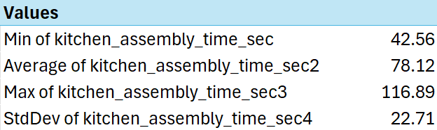 Once OK is selected, the worksheet is updated to only show the sandwiches with assembly times less than 60 seconds. Though it is not entirely clear, it looks like some Chefs are faster at assembly than others. Operationally, we might be able to learn the best way to assemble these sandwiches, and then train the other Chefs on the more efficient process.
