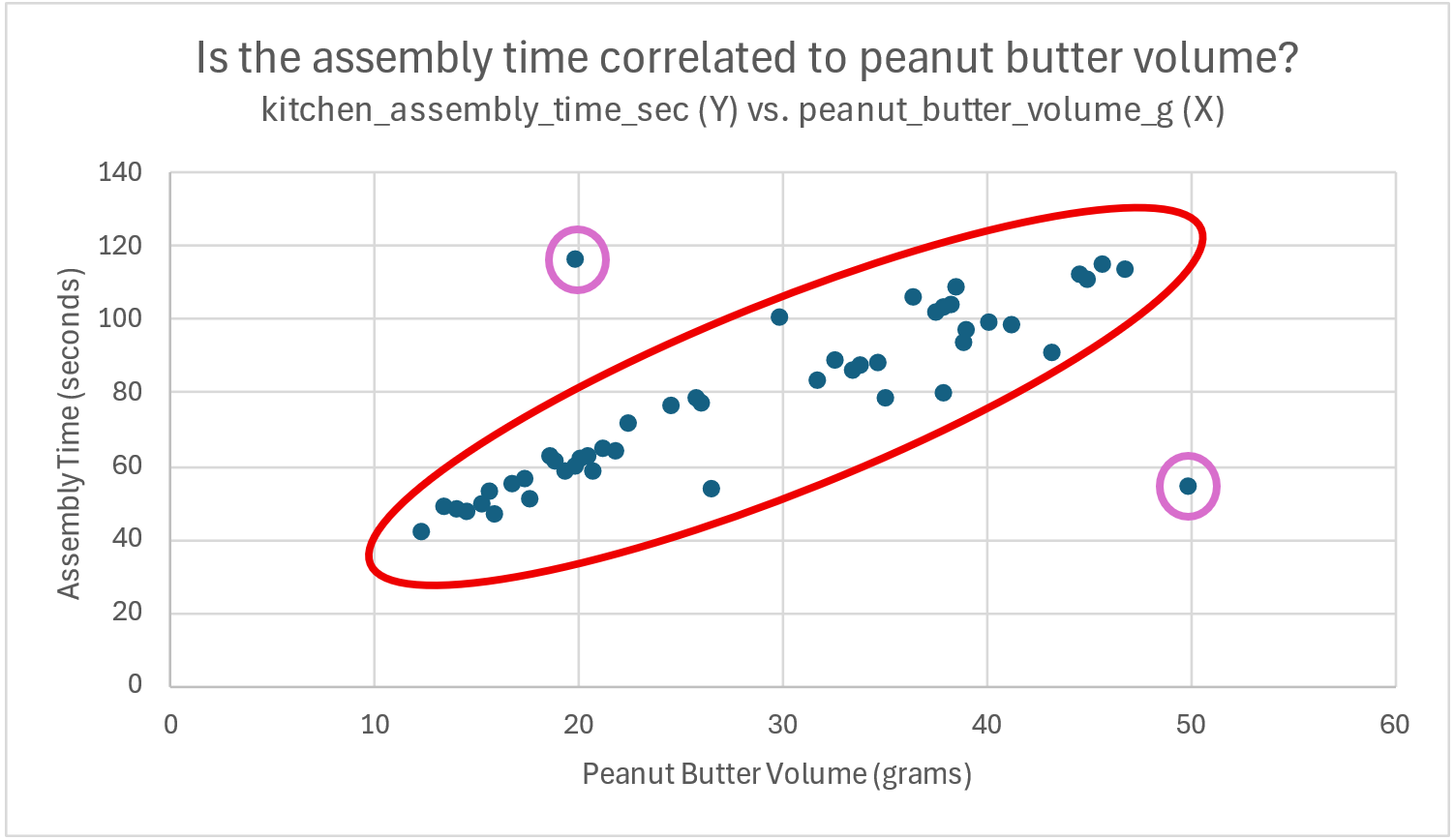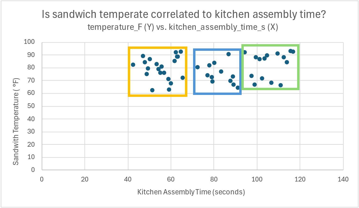 To get the data, Shef B. Foods conducted a randomized study, where they watched their 5 best Chefs make about 50 PB&H sandwiches using different kinds of ingredients and methods, as mentioned above. They recorded the ingredients (brands, volumes, weights), the sandwich temperatures, and the assembly times, as well as which Chef made each sandwich.